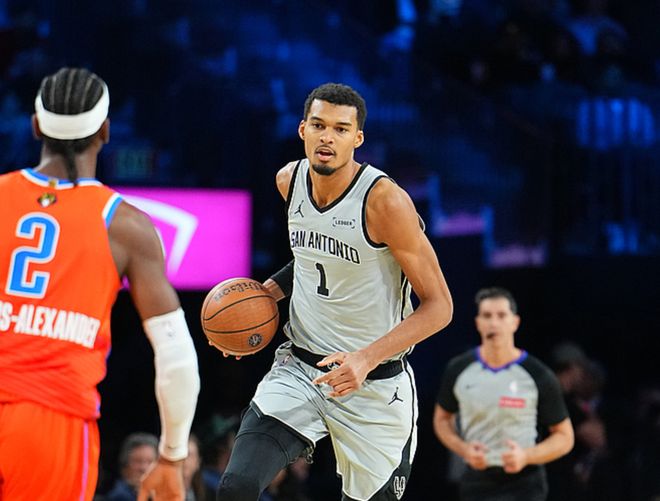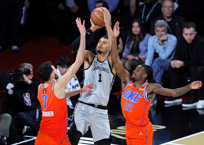 第三节比赛文班继续替补出战,马刺首发表现不错,反超了比分并一度领先6分,随后亚历山大开启得分模式,单节得到11分,三节战罢马刺领先1分。第四节比赛文班开启了强力模式,单节砍下15分,瓦赛尔也单节得到9分,最终马刺以111-109击败雷霆,完成16分逆转,晋级了NBA杯决赛。