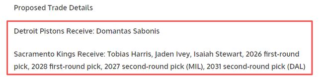 萨克拉门托国王得到:托比亚斯·哈里斯、贾登·艾维、以赛亚·斯图尔特、2026年首轮选秀权、2028年首轮选秀权、2027年第二轮选秀权(雄鹿)、2031年第二轮选秀权(独行侠)