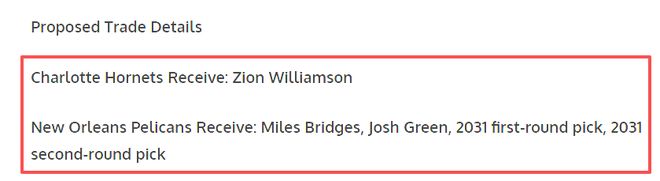 新奥尔良鹈鹕得到:迈尔斯·布里奇斯、乔什·格林、2031年首轮选秀权、2031年第二轮选秀权