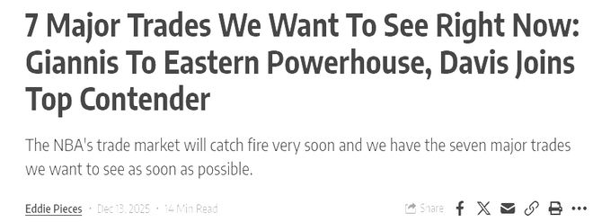 本赛季的NBA赛程已经快打完三分之一,联盟很多球队都暴露出各种各样的问题,急需在即将开启的交易市场寻求改变。而本赛季,多名巨星都卷入交易绯闻中,其中包括字母哥、浓眉哥两大冠军级别的内线,除了二人外,联盟还有5人有望在本赛季被交易。美媒露天看台列出本赛季外界最想看到的7大交易。