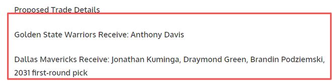 达拉斯独行侠得到:乔纳森·库明加、德雷蒙德·格林、布兰丁·波杰姆斯基、2031年首轮选秀权